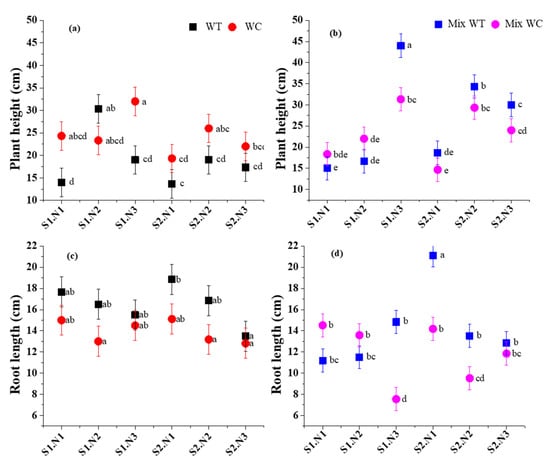 The root length of both species was not affected by S but was effected by N and C (Table 2, p > 0.05, p < 0.05), while their interactions, S × N and S × N × C, had a significant effect on both plant species (Table 2, p < 0.01). Root length of WC under competition was higher than WT in low submergence along with low nutrients (S1.N1 and S1.N2), while for the rest of all other levels, WT root length was taller than WC due to higher nutrients along with submergence, which facilitate WT (Figure 4d). In monoculture, root length of WT was higher, indicating more biomass allocation below-ground to make it more successful in submergence and high nutrient conditions (Figure 4c).