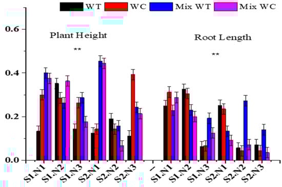 S, N, C and their interactions, S × N, S × C, N × C and S × N × C, were significant (Table 2, p < 0.05). Plant height of WC was more than WT in monoculture under high submergence and high nutrient (S1.N3). While under low submergence and low nutrients conditions (S1.N2) plant height of WT was higher than WC (Figure 4a). Plant height of WC in mixed culture was more than WT in low submergence along with low nutrients (S1.N1, S1.N2). Under low submergence with high nutrients (S1.N3) and high submergence with all nutrient concentrations (S2.N1, S2.N2 and S2.N3), WT has more height than WC because increasing submergence and high nutrients make WT more destructive than WC under competition (Figure 4b).
