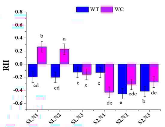 The relative competition interaction index of both species was significantly affected by S (F = 8.290, p < 0.01) and the interaction of S × N (F = 3.876, p < 0.05) but not significantly by N (F = 0.013, p > 0.05). Competition interactions were mostly negative for both of the species (Figure 7). The competition intensity of both species was significantly increased with enhancing submergence and nutrients. The competition intensity of WT was higher than WC in high submergence and high nutrients.