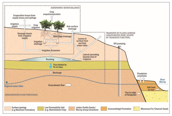 Irrigated agriculture leads to greater infiltration of water than non-irrigated agriculture, especially in semi-arid and arid regions [1]. This, in turn, leads to greater recharge to underlying groundwater systems, where it can cause salinization and waterlogging of agricultural land and salinization of water resources [2] and associated riparian zones. Where groundwater is fresh, irrigation recharge may have environmental benefits in returning fresh groundwater to streams and groundwater-dependent ecosystems and providing recharge for groundwater users [3].