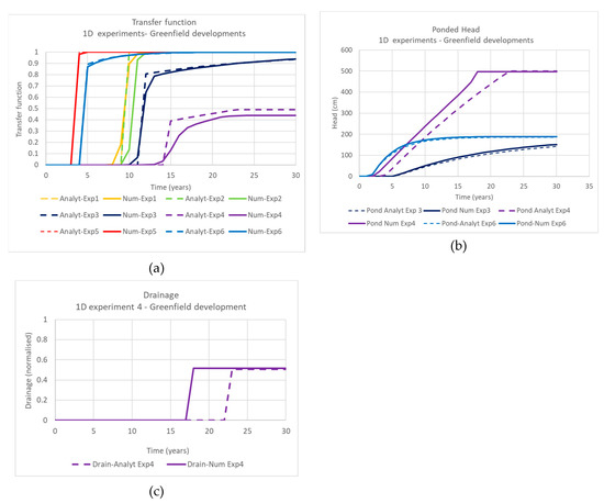 Of outputs from one-dimensional outputs from PerTy3 (semi-analyt-ical) (dashed) and FEFLOW (numerical) (solid) models (a) transfer functions; (b) ponded head and (c) normalized drainage volume.
