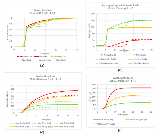 Comparison of outputs from two-dimensional semi-analytical and numerical modelling for new accession rate of 200 mm/year: (a) Transfer functions (Total) for B = 0.1, 1, 10; (b) Transfer functions (total, under irrigation field, external to irrigation field) for B = 10. (c) Perched heads for B = 0.1, 1.0, 10 for an increase in IA to 200 mm/year. The head for the FEFLOW model is for x = 0, while that for PerTy3 is an average across the irrigated field. (d) the width of the wetted zone outside the irrigation field for B = 0.1, 1.0, 10, and an increase in IA to 200 mm/year.