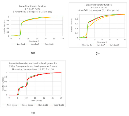 Functions for brownfield developments: (a) numerical outputs at varying distances from a pre-existing steady-state development and B = 0.1; (b) numerical outputs at varying distances from a pre-existing steady-state development and B = 10; (c) numerical outputs for the total development of a new development followed by another development, 250 m away for B = 1, 10 compared to superposition of numerical outputs for two independent developments, one 5 years after the other.
