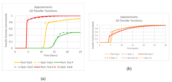 The trial of approximants was mostly successful with good matching with an exponential function (Figure 7). The worst fit was for Experiment 4 (1D) (Figure 7a). For this experiment, the ponded head reached the upper boundary condition by about year 17. This appears to change the temporal pattern of recharge, which is not captured by the approximant.