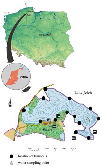 Lake Jeleń is located in northern Poland (54°12′04,4″ N, 17°31′31,5″ E) near the southeastern borders of the city of Bytów (population 17 k). It is a closed lake with a surface area of 81.6 ha. Its shape is irregular, elongated in the E-W direction (Figure 1). The central part of the reservoir is deep, with several depressions: 33 m (max. depth), 26 m, 24 m and 23 m, separated by shallowings. The mean depth is 9.2 m and volume about 7.54 hm3. At the northern shore, there are three shallow bays with a depth lower than 5 m. The bay located at the southeastern end of the lake is separated from the main lake basin by a narrow and shallow channel (Figure 1). In periods of lower water level, contact between the lake and bay is severely limited. The lake catchment covers an area of 281.2 ha. The largest (53%) part of the catchment (over 150 ha) is used for agriculture. Only 35% of the catchment is covered by forest (100 ha (mainly beech and oaks)). There are no compact built-up areas in the direct catchment. However, a recreational resort is located on the southern bank. The resort consists of a restaurant, several summer houses, a BBQ area, campsite, swimming platforms and a parking lot [16]. A fishing club belonging to the Polish Angling Society is located close to the resort.