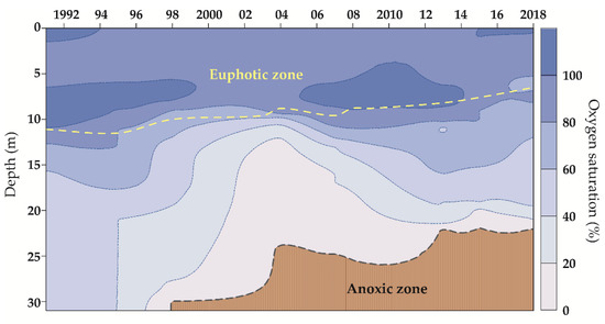 Changes in the values of most of the analyzed physical and chemical parameters of Lake Jeleń water in the period 1991–2018 indicate a deterioration of its quality. At the beginning of the studies, almost all the water column was well oxygenated, and even in the sub-bottom layer, the saturation of oxygen was over 50% (Figure 2). Over time, gradual deterioration of oxygen conditions, especially in the deeper parts of the lake, was observed. In 1998 a total oxygen deficit appeared in the sub-bottom zone of the lake. The anoxic layer became more and more extensive. In August 2018, the volume of deoxygenated water was almost 500 000 m3 and the total O2 deficit extended from a depth of 22 m to the bottom of the lake (Figure 2). Between 1991 and 2018, a gradual increase in the concentration of nutrients in Lake Jeleń could be observed.