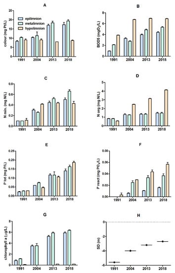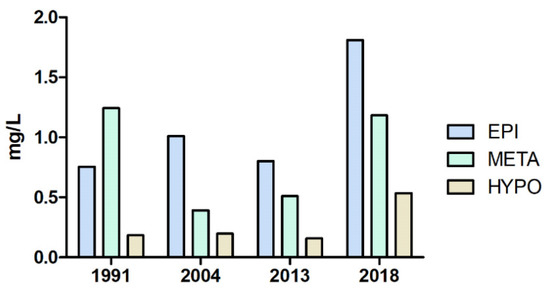 In 1991 orthophosphates were found only in the hypolimnion (with a concentration of about 0.005 mg PO4/L). By 2004 this form of phosphorus was found in the entire water column, and gradually over time, the concentration increased (Figure 3). For the period 1991–2018, for all thermal layers, the difference in PO43− concentration was statistically significant (ANOVA, p < 0.001). Moreover, the concentration of almost all forms of nitrogen significantly increased over the 27 years of surveys. Between 1991 and 2018, the average concentration of mineral nitrogen rose over 5-fold and organic nitrogen over 3-fold (Table 1). The most significant increase was observed for organic N in the hypolimnetic zone of the lake (ANOVA, p < 0.005). In the studied period, an increase of easily degradable organic matter (expressed as BOD) was also found (Table 1, Figure 3).