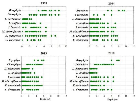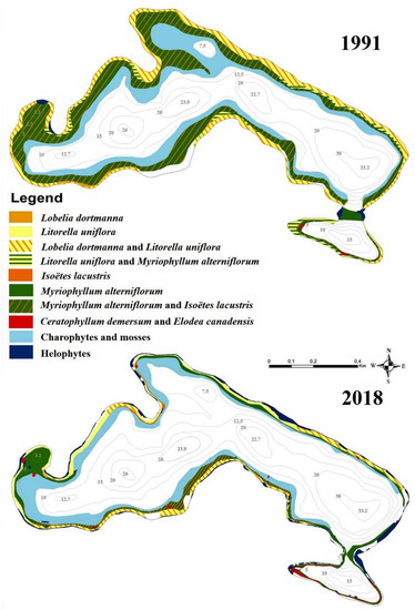 In the last year of the study, isoetids occurring in the shallower littoral, i.e., L. dortmanna and L. uniflora, were recorded only to a depth of 2.0 m, while previously they were found at 4.0 m, and L. uniflora sporadically even deeper (Figure 5 and Figure 6).