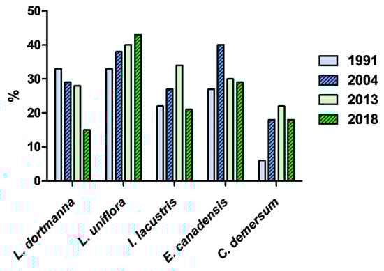 The frequency of the most important taxa—isoetids and eutrophic elodeids—was analyzed. Comparing 1991 and 2018, each isoetid species showed different trends. The frequency of L. dortmanna decreased 2-fold, and the frequency of L. uniflora increased, whereas the frequency of I. lacustris at first increased and between 2013 and 2018 decreased. The 3-fold increase in the frequency of C. demersum (from 6 to ca. 20%) and a slight increase of E. canadensis indicated changes in the lake (Figure 7).