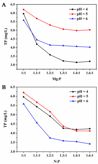 Fixing Mg:P to 1:1, adjusting different pH to 4.0, 5.0, and 6.0, and then NH4Cl with different N:P molar ratio was added into the wastewater. The effect of molar ratios of N: P on TP removal is shown in Figure 1B. It can be seen that when N:P molar ratio is increased, the TP concentrations in the wastewater also decrease. When the initial pH is 6.0, the overall removal effect of TP is the best, followed by the phosphorus removal effect with the initial pH at 4.0. When N:P is 1.2:1, the minimum remaining amount of TP is 3.74 mg/L. When N: P is higher than 1.2:1, the change of TP concentration is small and tends to be stable.