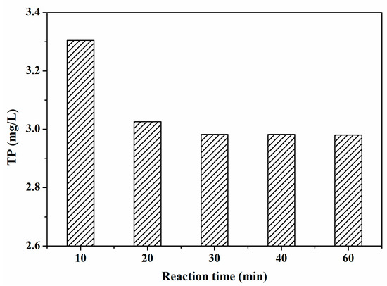 Adjust the pH = 4.0, control the material dosing ratio of Mg:N:P = 1.2:1.1:1, and leave it for 20 min to observe the effect of TP removal under different stirring reaction times. As can be seen from Figure 2, when the reaction time was 10 minutes, the TP concentration was 3.30 mg/L, and it remained almost unchanged when the reaction time reached 20 minutes. It can be seen that the formation rate of struvite crystals is very fast, as observed during the experiment that a large amount of precipitation will occur immediately after the magnesium salt and the ammonium salt are added. Comprehensive consideration, the reaction time of 30 min was selected as the optimal reaction time. At this time, the TP concentration was reduced to 2.98 mg/L, which meet the discharged sewage standard in China (≤5 mg/L, Quality Standards for Sewage Discharge into Urban Sewers, GB 31962-2015) and can ensure the full progress of the reaction and reduce energy consumption.