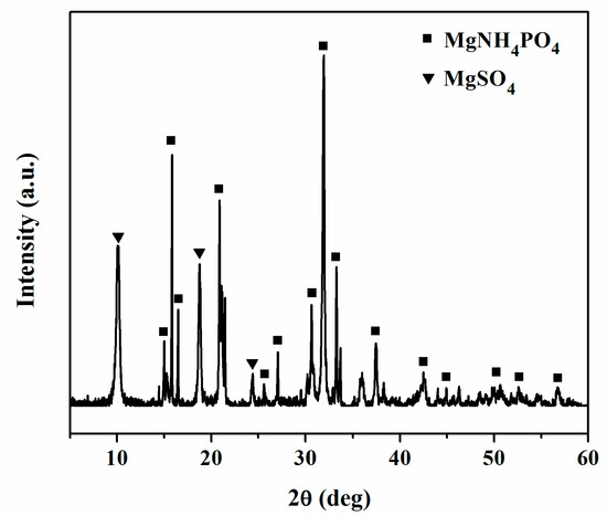 Comparison of struvite methods using three different combinations of agents are listed in Table 4. The TP removal rate by the agents groups of [Mg(OH)2+NH4Cl], [MgCl2·6H2O+NH4HCO4], and [Mg5(CO3)4(OH)2·4H2O+NH4Cl] are 4.91 mg/L, 5.72 mg/L, and 2.98 mg/L, separately. In the three groups of reagents, the consumption of magnesium hydroxide was less, because of its lower solubility [20]. Magnesium chloride has low toxicity and excessive intake is harmful to human health, so it is not suitable for large-scale use to reduce phosphorus ions [21,22]. In terms of the pH value of the solution after the reaction, the pH values of the three groups all meet the discharged sewage standard in China (range of 6.5–9.5, Quality Standards for Sewage Discharge into Urban Sewers, GB 31962-2015). In addition, it can be found that the concentration of sulfate in the wastewater is also reduced. This is because the sulfate and the magnesium salt also react to form a magnesium sulfate precipitate, which can be confirmed from the XRD patterns of struvite precipitation. It can be seen in Figure 3 that the main component of struvite precipitation is magnesium ammonium phosphate, but there is also a small amount of magnesium sulfate [23].