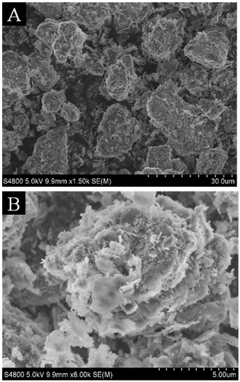 As shown in Figure 4, the precipitated powder obtained by the reaction of Mg5(CO3)4(OH)2·4H2O and NH4Cl was magnified 1500 (A) and 8000 (B) times, respectively. As shown in Figure 4A, the struvite precipitation was observed as guano-like clusters. Combined with the experimental phenomena recorded during the experimental process, it was verified that the struvite deposits formed by the reaction are easy to settle in water, which is beneficial to the recycling and actual use. As shown in Figure 4B, the surface of the struvite sediment can be seen as a whole in a layered form, which indicates that the struvite precipitates in a layered manner, and is arranged neatly and regularly. However, it can also be seen that a small amount of irregular substances are mixed in, and the impurities do not have a specific form. According to the ionic data of the reaction process, it is likely that the residual Mg5(CO3)4(OH)2·4H2O is undissolved solid, but the proportion is very small.