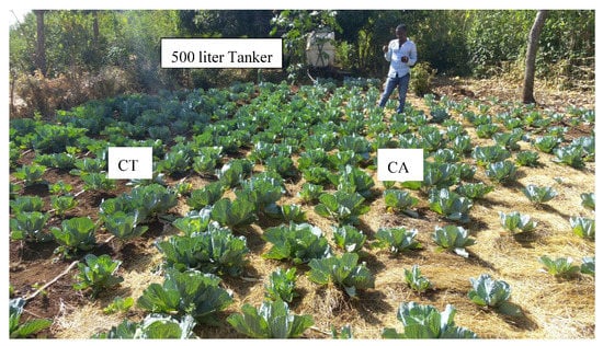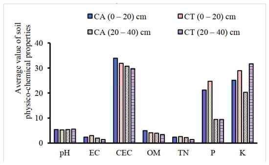 Tillage practice affects organic matter availability in the soil in which its amount depends on various site-specific conditions; rainfall, air temperature, management practice, type of plant, soil temperature, and drainage condition [] and has its consequence on soil structural stability, soil erosion, and nutrient availability in the soil []. As shown from Table 2, at the beginning of the experiment (3rd cycle vegetable production, after two years of mulch application), CA has a greater mean difference in organic matter (4.8) than CT (4.3) which is significantly higher at 10% significant level in Dangishta (Table A1). This is because CA improves organic matter availability in the soil as a result of the biological decomposition of organic mulch covers.