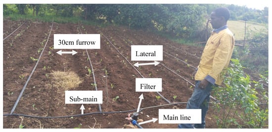Rainfall variability and irregularity are major concerns in a rainfed production system and smallholder farmers are vulnerable in crop production. Crop failures are common in the region due to rainfall variability and frequent drought [,]. Consequently, food insecurity often turns into famine with the least adverse climatic incident, predominantly, affecting the livelihoods of the rural poor [,]. Expanding small-scale irrigated agriculture could play a significant role in sustaining the livelihood of smallholder farmers. However, only 4% to 5% of the cultivated land in Ethiopia is under irrigation [] with poor water use efficiency, about 40% []. Water availability is limited in the long dry season in the nation which necessitates the use of efficient water application technology in expanding irrigated agriculture.
