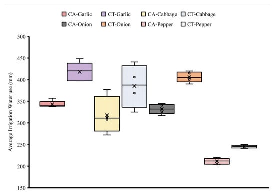 Farmers applied a relatively small amount of irrigation water on CA as compared to CT. A one tailed paired t-test was done (Table A3) and the average irrigation water use of cabbage, onion, garlic, and pepper was significantly (α = 0.1) higher in CT than CA. The average irrigation water used in CA showed a significant decrease (18%) as compared to CT in the cabbage experiment. About 385 and 318 mm of average irrigation water was applied to the CT and CA systems (Figure 5) for cabbage production, respectively. Allen et al. [] explained that the average water consumption of cabbage varies from 350 to 500 mm depending on differences in the climate and soil condition. The amount of water applied to cabbage in the CA plot (318 mm) was below the lower limit suggested by Allen et al. [] indicating significant soil moisture improvement under CA practice. CA reduces soil evaporation and preserves soil moisture due to the mulch cover and improvement of soil quality and structure through the biological decomposition of the organic mulch. The amount of water applied to cabbage in CT plots was consistent with Allen et al. [] findings. Similarly, Tiwari et al. [] estimated the average seasonal water requirement of cabbage to be 400 mm on clay soil and sub-humid climate. The average irrigation water applied to garlic was 275 mm in CT and 199 mm in CA plots. A significant irrigation water use was observed for garlic (28%) in CA when compared with CT. Similarly, a significant irrigation water saving was observed for onion and pepper under the CA treatment. The result showed there was 18% and 14% irrigation water savings under CA over CT treatment for onion and pepper, respectively. The average irrigation water applied in the onion experiment (Figure 5) is consistent with Bossie et al. [] and with Tebal [] for pepper in the CT plots. A one-tailed paired t-test analysis is presented in the Appendix B (Table A3).