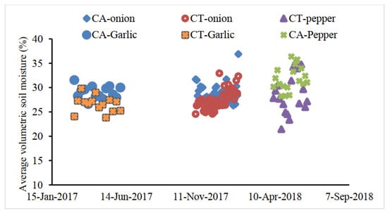 Average volumetric soil moisture content for CA management and CT practice in Dangishta experimental watershed under onion, garlic, and pepper experiment.