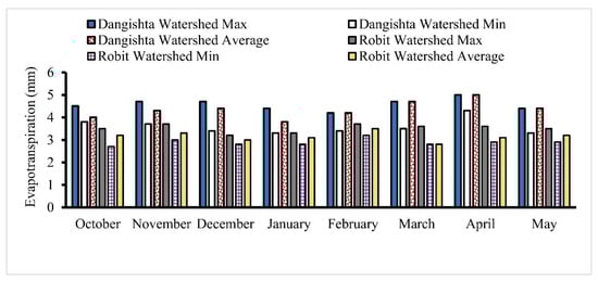 Maximum, minimum, and average reference evapotranspiration (ETo) in mm/day for Dangishta and Robit watersheds.