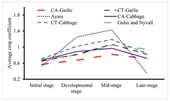 Crop coefficient values of garlic compared with Ayars [] and cabbage compared with Gulik and Nyvall [] for CA management and CT practice.