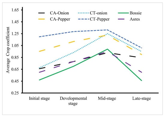 A relatively higher crop coefficient result has been found under CT practice than CA (Table 4). The higher crop coefficient obtained under CT management system can be associated with higher irrigation water use and losses associated with soil evaporation. The dual crop coefficient approach is ideal to understand the impacts of soil wetting by rainfall or irrigation and for estimating the effect of conservation practice in reducing soil evaporation. In this study, the single crop coefficient approach was used for determining crop coefficients at the different growing stages. The dual approach divides the crop coefficient in to crop transpiration and soil evaporation coefficients [,,]. The crop transpiration coefficient “basal coefficient” needs more parameters to be determined and needs more numerical calculations. The soil evaporation coefficient (Ke) also needs estimation of constant parameters from a range of values which results in overestimation or underestimation of the coefficients. The crop height at each growing stage was not measured for basal coefficient determination and therefore the single crop coefficient was used. As the crop develops, the ground cover, crop height, and the leaf area also change which brings differences in the amount of evapotranspiration during the various growth stages, which finally brings variation in the crop coefficient.
