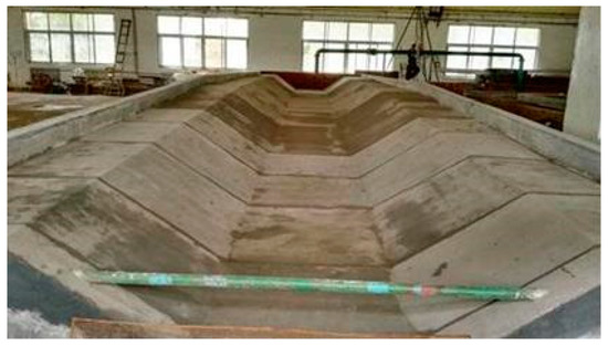 Figure 1 shows a schematic diagram of the model design. The model included an impounding pool, a test section in the fishway and a tail pool. The tail pool and the impounding pool were connected by a groundwater reservoir. Four fishway types, with impermeable, semi-permeable and fully permeable rubble walls, were arranged in the test section. The cross-section of the fishway was trapezoidal, as shown in Figure 1. The length of the fishway test section (L) was 17 m, including a total of 11 fishway pools, and the longitudinal slope (J) was 1%. The bottom and the side slope of the fishway were smoothed by concrete. The bottom width (a) was 0.75 m, and the side slope (ia) was 1:2.5. The flow velocity and flow patterns were analyzed, as described in the following paragraphs, by taking the fish channel and the intermediate pond in the fishway test section as typical research objects. Figure 2 shows a picture of the original experimental model.