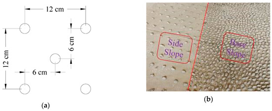 Scenario II represented the scheme with bottom roughening. During the test, concrete blocks with an equivalent particle size of 2.0 cm were used to simulate sand gravel, and the spacing between concrete blocks at the bottom of the channel was about 1 cm, as shown in Figure 3. After the concrete blocks were laid at the bottom of the channel, the average value of roughness was increased to 0.023. In addition, according to the research results published by Hou et al. [31], the slope could be further roughened by the quincunx roughening method. The equivalent particle size of the roughened material was 2.0 cm, and the spacing between the particles was 12 cm. Therefore, an overall roughness test of the channel was carried out (scenario III), and the concrete arrangement is shown in Figure 4. The overall roughness of the channel reached 0.034.