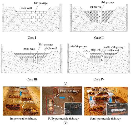 One of the main features of the nature-like fishway is the use of natural stones to construct the inner partition wall of the fishway. The wall can be constructed to be either permeable or impermeable. In this regard, rounded cobbles were used to simulate the permeable rubble wall. The diameter of the cobbles was 10–15 cm. A brick wall was used to simulate the impermeable masonry wall. The specific layout was determined by comparing the two kinds of walls and their combined types. According to the research results on the living habits of the target fish, the migration characteristics of the four major Chinese carps are different. Therefore, this study added a design scheme using multiple fish passages to complicate the flow pattern and improve the selectivity of upstream migration paths for fish. In this regard, in addition to the water permeability of the partition wall, different widths of the fish channel and different numbers of fish passages were comparatively studied through experimental investigation. The comparison schemes are shown in Table 2. Among them, case I was the arrangement of the water-impermeable partition wall, case II was the arrangement of the permeable partition wall, and case III and case IV were the arrangements of the semi-permeable partition wall. The water permeability of the fully water-permeable partition wall was 12%. The schematic diagram of the layout of each case is shown in Figure 5. From Table 2, it is seen that the thickness of the partition wall was different, but the height was the same. This is because the thickness depended on the structural stability, and the height was due to the water level. If the height was different, it would affect the discharge and flow velocity. However, the influence of the thickness could be ignored because the key factor of the effect on hydraulics in the pool was the uniformity of the pool length, which had a value of 1 m in the present study.