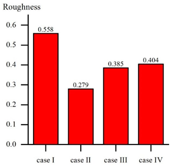 Channel roughness evaluation is very important in fishway hydraulics, especially for nature-like fishways [33]. Velocity and discharge relationships are influenced by channel roughness [34]. For a given slope, velocity increased as discharge increased and roughness decreased. The roughness values for the fishways of the four schemes in this paper are illustrated in Figure 7. As shown in the figure, the roughness value of case I is much larger than those of the other cases and is nearly double that of case II. This is because the partition wall for case I was constructed by brick, which is an impermeable material. When the partition wall was constructed by cobbles for case II, which is a fully permeable material, the flow resistance was be decreased and the porosity increased. For cases III and IV, the partition wall was constructed by a semi-permeable material, so the roughness was between the two extremes (increasing by about 40% compared with that of case II and decreasing 30% compared with that of case I). It should also be pointed out that the roughness values of case III and case IV were nearly the same in spite of their different numbers of fish passages. This is because the porosity of the partition walls was the same for the two cases, and the flow areas were also uniform.