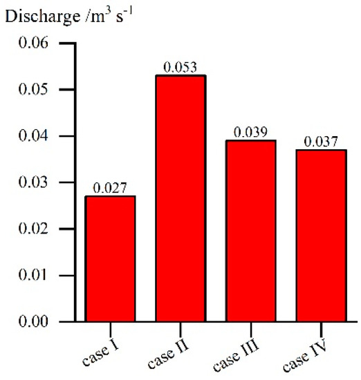 Discharge is one of the important indicators that need to be considered when a fishway project is selected and implemented [35]. A larger discharge means that more abandoned water will be generated from the gated dam, which will affect the operational benefits of the project. Figure 8 compares the results of the discharge under different fishway schemes. The results show that the discharge of the fishway of each case was quite different. The discharge of the fishway constructed by the impermeable partition wall was only 0.027 m3/s (case I). The discharge of the fishway constructed by a permeable partition wall was 0.053 m3/s (case II), which is twice the discharge of case I. When the rubble wall was made of a combination of permeable cobbles and impermeable material (case III), the wetted cross-sectional area of the fishway channel was increased compared with that of the case I and was reduced compared with that of case II, so the discharge of the fishway for case III was 0.039 m3/s. Compared with case III, the number of fishway channels was double in case IV, but the total cross-sectional area of the fishway channels was unchanged. Under this condition, the discharge of the fishway was reduced to 0.037 m3/s.