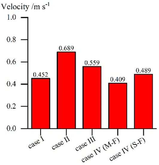 According to the basic principles for fishway design, the maximum flow velocity in the fishway pond generally appears near the inlet of the fishway. Its size determines whether the fish can successfully pass through the pool. The flow velocity in the fish passage is the main fishway design indicator, the value of which should not exceed the burst swimming speeds of the fish [36]. Figure 9 shows the comparison of the average flow velocity at the cross-section of the fish passage. In the figure, the velocities of flows M-F and S-F in case IV represent the average of the cross-sectional flow velocity in the middle fish passage and side fish passage (as shown in Figure 6), respectively. It can be seen from the figure that the maximum flow velocity of the fishway occurred in case II, in which the flow velocity reached 0.69 m/s. Under the other three schemes, the average flow velocity in the fish passage was only 0.45–0.55 m/s.