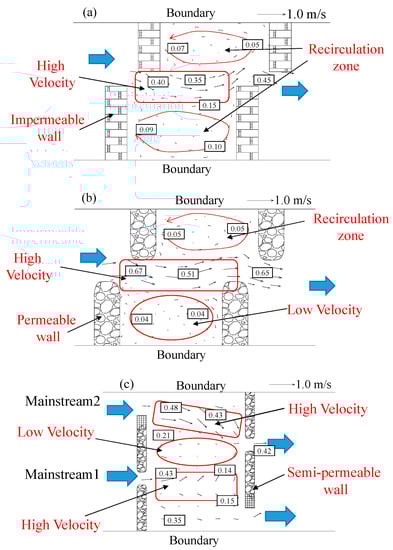Under the impermeable condition (case I), the flow pattern distribution was basically the same as that of the technical fishway [38]. The flow velocity distribution was relatively simple, the mainstream area was concentrated, and two recirculation zones were formed in the rest zone, as shown in Figure 10a. The flow velocity in the zone between the mainstream and backflow was close to zero. In contrast to the flow pattern of case I, when the partition wall was constructed by fully- or semi-water-permeable material, such as in cases II and III, more diverse flow conditions were formed at the surface of the pool. Figure 10b shows that the mainstream was no longer concentrated, and the two recirculation zones on both sides of the mainstream diminished or disappeared. However, there was still a relatively high flow velocity zone at the fish passage, which would exceed the critical swimming speed of most migratory fish for a project in China. On the basis of the hydraulic theory, if the discharge is uniform, then the larger the flow area, the smaller the flow velocity. Hence, in the present study, an increase in the number of fish passages was put forward to increase the flow area. In order to control the discharge and flow velocity, two fish passages were staggered left and right, as shown in Figure 6. It was found that two mainstreams were formed in the fishway for the case with two fish passages, as shown in Figure 10c. Three flow regions were formed in the pool by the two mainstreams, with two high flow velocity regions and one low flow velocity region. The flow velocity in the low flow velocity region was about 0.02–0.30 m/s, and a weak recirculation zone was formed inside the region, which could serve as a rest zone for migratory fish. The average flow velocity in the high velocity regions was about 0.50 m/s, which meets the swimming speed of most migratory fish in China.