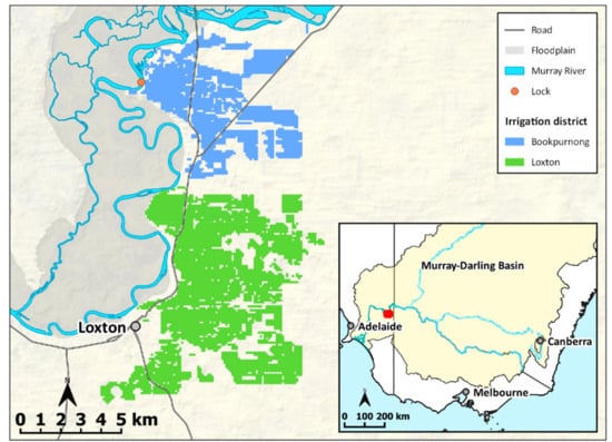 Location of the Loxton and Bookpurnong irrigation districts (the red marking on the inset map shows the location of the study area map).