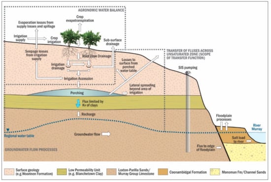The objective of this study was to make use of the transfer functions developed by [,] and develop an integrated modelling method to quantify the groundwater returns from irrigation for the management of salinity in the lower Murray River, Australia. The integrated approach links the various elements of hydrological system involved: (1) the surface/rootzone, (2) the deeper vadose zone, and (3) the saturated zone. The integration of all three elements is intended to reduce the risk of biases that are inherent in current methods by allowing the models to make full use of the datasets available, as well as to create a transparent process to simulate the impact of various management actions. The method must be applicable on a catchment-wide scale and be practical to implement; that is, it should not impose an unnecessary burden on existing model workflows and their data requirements.