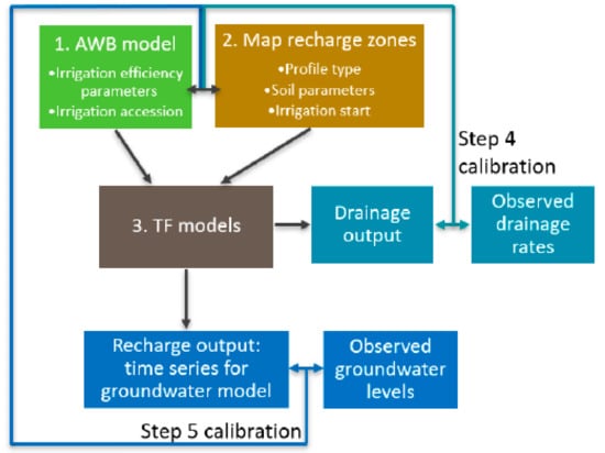 Various options can be employed to integrate the AWB and TF models with a groundwater model. In this study, a staged integration was undertaken to assess the merits of the approach. We considered a base case and two potential methods that integrate the AWB and TF models with the groundwater model focusing on different calibration approaches (Table 1).