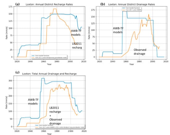 Comparison of recharge and drainage rates derived from existing methods and datasets (plotted in orange) to those derived the new agronomic water balance (AWB)-transfer functions (TF) models (plotted in blue) for the Loxton irrigation area, showing (a) techarge rates, (b) drainage rates, and (c) total drainage and recharge rates.