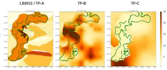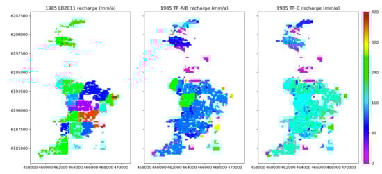 Distribution of irrigation recharge in 1985 within the existing LB2011 model, the TF-A/B model, and TF-C model.