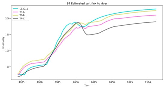 Estimated salt flux associated with groundwater returns to the river for the different models used. The modelled salt flux was determined using the calibrated models up until 2011. For LB2011, future projections were determined by assigning a constant irrigation recharge of 100 mm/year. For the other models, future projections were determined in accordance with the AWB and calibrated irrigation efficiency for 2011 and running this for 100 years through the TF models to generate a recharge rate into the future.