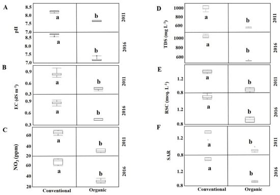 Soil EC—similar to soil pH—can also control the EC of the leachate reaching the well water. Thus, higher values of EC in the well water of conventional fields (see corresponding values for samples collected before transplanting Figure 1B) may be attributed to the higher amounts of dissolved ions in soil solution leaching down due to the excess of the available form of nutrients (i.e., surplus amount) from applied fertilizers. The EC in well water usually depends on the presence of dissolved mineral matter (solid content; TDS). The TDS values of well water samples collected from conventional fields were 1.97 (for 2011) and 2.09 (for 2016) times higher than those collected from organic fields (see corresponding values for samples collected before transplanting in Figure 1D). Moreover, the TDS values of well water samples from our conventional fields were always above the drinking water threshold limit of 500 mg L−1; however, corresponding values from organic fields indicated that water samples from organic fields may be suitable for drinking purposes [18].
