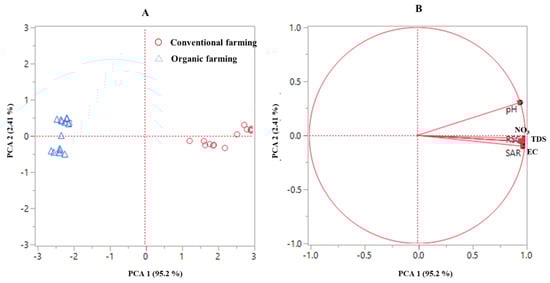Biplot (A) and loading plot (B) from the principal component analysis of groundwater quality parameters under organic and conventional rice cultivation systems (n = 42 by combining both years) in Kaithal, Haryana, India.