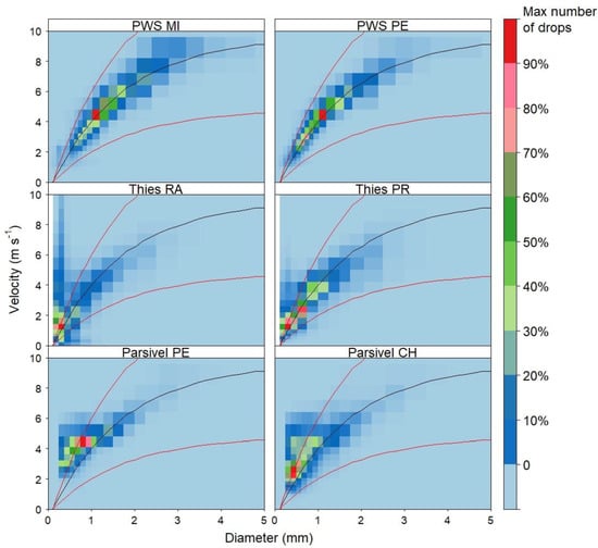 Drop size and velocity distribution for all disdrometers at each site. The color legend describes the percentage of drops in each drop size and velocity class as a percentage of the number of drops in the class with most drops. The black line is the terminal velocity line drawn after Atlas et al. []. Drops in classes outside the red lines deviate more than 50% from the terminal velocity line.