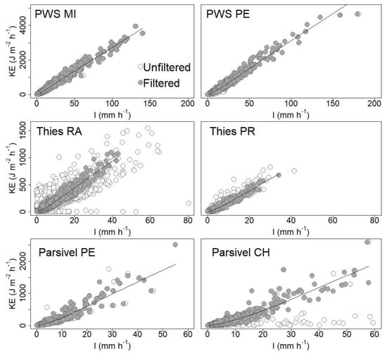 Drops deviating more than 50% from the value of the Atlas et al. [] diameter–terminal fall velocity relationship were not included in the calculation of KE for establishing the KE–I relationships. A similar filtering was also applied in other studies [,,,,,,] to remove erroneously measured drops. Both Parsivel data sets were also cut off for rainfall intensities above 60 mm h−1 to eliminate outliers that were not removed by the filtering.