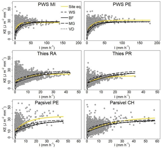 After filtering, the best fitting exponential curve and its equation parameters were found for each disdrometer and site (Figure 3 and Table 4). PWS MI recorded minute intensities up to 140 mm h−1 and PWS PE recorded intensities up to 180 mm h−1. This was 2–4 times higher than the other disdrometers, which recorded maximum intensities between 34 mm h−1 and 58 mm h−1. This may limit the reliability of the developed KE–I relationships on higher intensities. PWS MI and PWS PE also recorded the highest KE values.