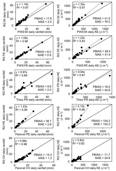 The new site-specific KE–I relationships developed from the PWS MI, PWS PE, Thies PR, Parsivel PE and Parsivel CH were tested by applying them to the intensities measured by rain gauges at the measurement sites and calculating daily KE and comparing it to the measured KE from the disdrometers (Figure 5). For all sites but CH, the rain gauges generally measured higher total daily rainfall amounts and KE than the disdrometers. The overall lowest deviation between disdrometer and rain gauge was found for PWS PE with a PBIAS of 6.2%. The rain gauge in PE was of the weighing type and these have been found to have higher accuracy than tipping buckets [,]. The highest deviation in daily rainfall amount was observed between Parsivel PE and the same rain gauge with a PBIAS of 39.7%, which suggests degraded performance of the disdrometer.