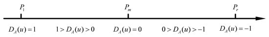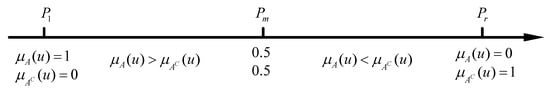Existing research [,] indicates that is a region by a fuzzy set of opposite concepts and is a random element in , i.e., . and are, respectively, defined as continuous intervals expressed by two endpoints 1,0 and 0,1 that correspond to attraction and repellence. The relative membership functions of that point to and are and , which express the degrees of attraction and repellence, respectively. The relative membership relationship of and can be expressed by Equation (1) and Figure 1 as follows: