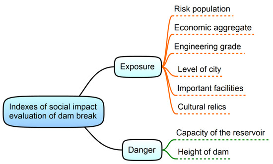 Historically, most attention has been given to the loss of life and economic costs associated with dam breaks [,,,]; however, there is increasing awareness of the need for environmental protections, which includes the potential effects of dam breaks [,]. The concern of all parties regarding the effects of dam breaks is called the social impact. For many projects under construction or already in operation, a comprehensive evaluation should consider the financial, economic, environmental, and social effects of a dam break, where social impact evaluations are the highest level of evaluation []. Social risk is an area of great concern and since its inception it has been applied in many fields, such as vehicle fuels [], social media communication [], social rating philosophy and Foundations of Banking Origin [], wildfires [], and raw material supplies []. Social impact assessments consider many factors, including business investment, institutional culture, and engineering economy. The amount of attention given to the social impact of hydraulic engineering construction is increasing and the World Commission on Dams has proposed a systematic dam social impact assessment system which provides guidelines for assessing the social impact of hydraulic projects [,,]. Since then, the social impact assessments for water conservancy projects and the combination of qualitative and quantitative methods have been being adopted [,,,,]. Existing research on social impact assessments for water conservancy projects indicates that they were late to be established and that existing assessments are focused on dam construction and operation. Few studies have focused on social impact assessments for dam breaks. However, due to the huge loss of life and economic cost associated with dam breaks, the social impact of such incidents should not be ignored.