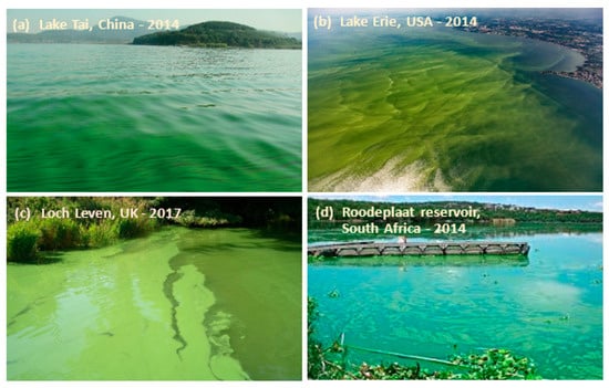 Cases of freshwater eutrophication in (a) China [2], (b) USA [3], (c) UK [4], and (d) South Africa [5]. Note: the photos were derived with modification from the original sources.