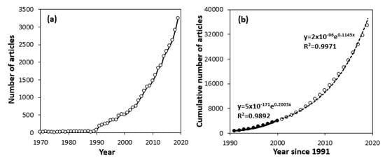 Publication patterns and modelled characteristics of papers addressing river and lake restoration ((a) the number of articles from 1970 to 2019; (b) the relationship between the cumulative number of articles and year published, since 1991).