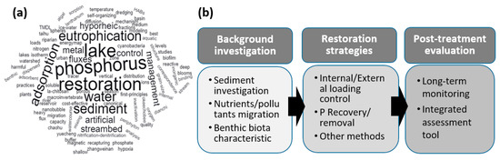 The top five most frequently used keywords in all of the articles selected from the database are “Eutrophication”, “Phosphorus”, “Algae” “Water quality” and “Nitrogen”, which, coincidentally, show high correlation with the frequent keywords used in the 12 papers from this Special Issue (Figure 3a). Phosphorus and nitrogen have long been recognised as crucial nutrients for harmful algal growth in eutrophic waters [11]. In addition to the input of external pollutants from wastewater or runoff waters, the embedded sediment-bonded nutrients can be released back to the water column, especially under hypoxic conditions at sediment–water interfaces [12]. Thus, integrated restoration strategies always consider the control of both external and internal nutrient loadings. In order to select the appropriate restoration technology and estimate the potential risk to the surrounding biota, it is crucial to conduct a background site investigation and understand the potential effects of pollutant migration. Without a long-term monitoring plan and evaluation of the final restoration, it is impossible to assess the success or failure of the treatment. The studies from the current 12 papers in this Special Issue perfectly cover these three aspects (Figure 3b): background investigation, restoration strategies and post-treatment evaluation.