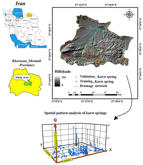 Karst spring location with hill-shaded map of the study area, Khorasan Shomali, Iran.