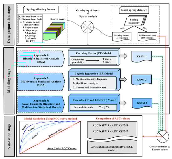 Ensemble modelling is the combination of multiple predictive models that are used conjunctively to provide an evaluation of the same dataset []. Ensemble modelling approaches have been widely used in different fields, including groundwater [,,,,,,,], flood [,,,,,,,,,,], landslide hazard [,,,,,,,,,,,,,,,,,,,,,,,,,,,,,], land/ground subsidence [,], gully erosion [,], dust storm [], wildfire [], sinkhole [], droughtiness [,], earthquake [,] and species distribution [,,]. These studies provide clear evidence that the application of ensemble models can potentially result in improved capability (over individual methods) of GIS-based statistical models []. However, previous studies aimed at the prediction of karst spring occurrence have not investigated the potential of ensemble models that integrate bivariate and multivariate statistical models to support the construction of spring potential maps [,].